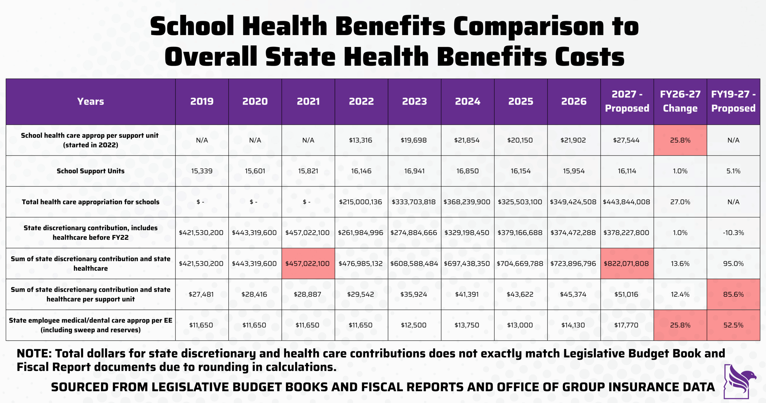Beginning in FY22, the discretionary funds were split into a general discretionary pot and a separate health insurance appropriation. From 2019 to 2021, the discretionary pot had grown about 4% per year. However, when the healthcare funds were split out, the discretionary funds were reduced, but not by nearly as much as the new healthcare funds. For FY27, the proposed appropriation for discretionary money plus health care for schools is over $800 million, nearly double what it was before H443.