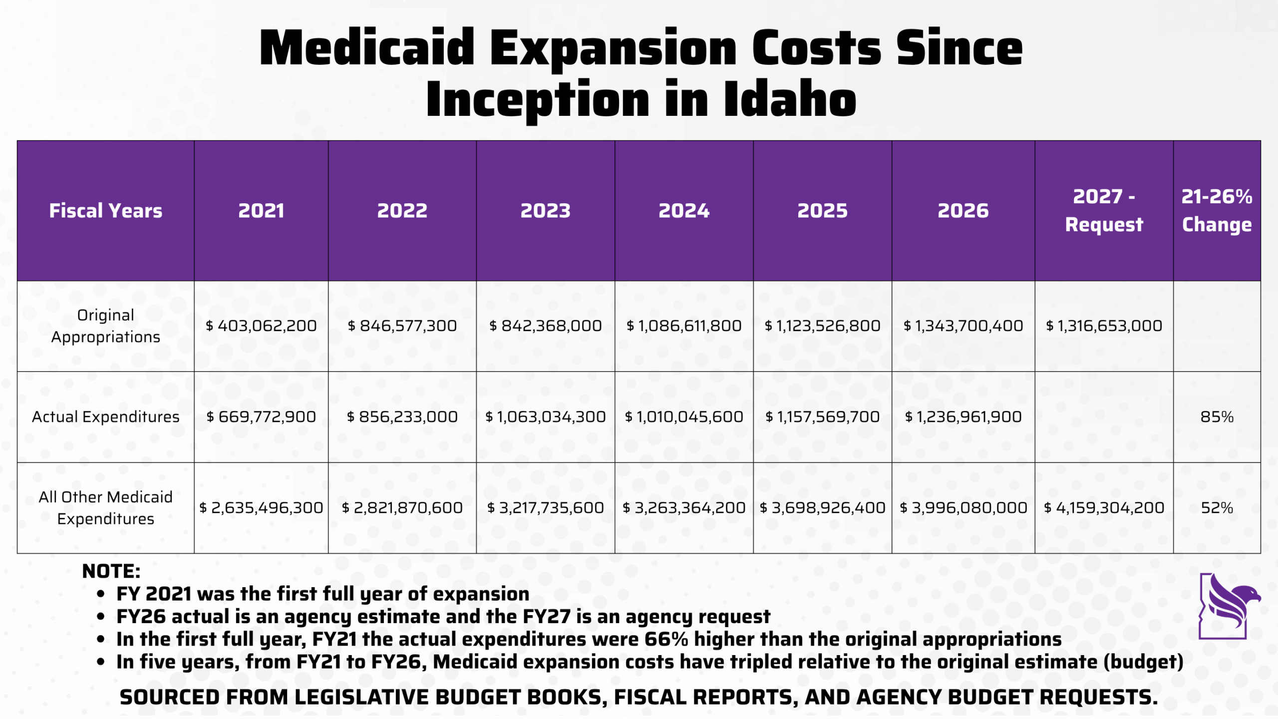 Right out of the gate, in its first full year, Medicaid expansion cost 66% more than was originally appropriated. In the past five years, using estimates for Fiscal Year 2026 expenditures, program costs have tripled from the original cost projection. And when you review the numbers, it is quite clear that Medicaid expansion, not the core Medicaid program, has grown faster over the last five years. Don’t be persuaded by the slowing of the increase, because after tripling from original projections, it is still running at an unsustainable rate. Remember, core Medicaid was designed for poor children and people with disabilities. And Medicaid expansion added able-bodied adults, who should be working. Our view is that the case for repealing expansion is the only way to rein in the growth of the program, and the data bear that out. Idaho would save $1.3 billion, 90% of which is borrowed federal dollars.